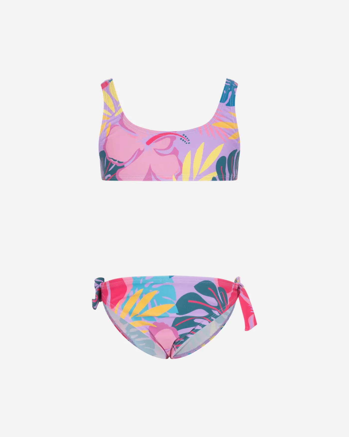 Il bikini per bambina Admiral è l’ideale per aggiungere un tocco allegro e spensierato alle vacanze estive. Il top a spalline è decorato con una vivace stampa foliage multicolor, perfetto per un look vivace e alla moda.