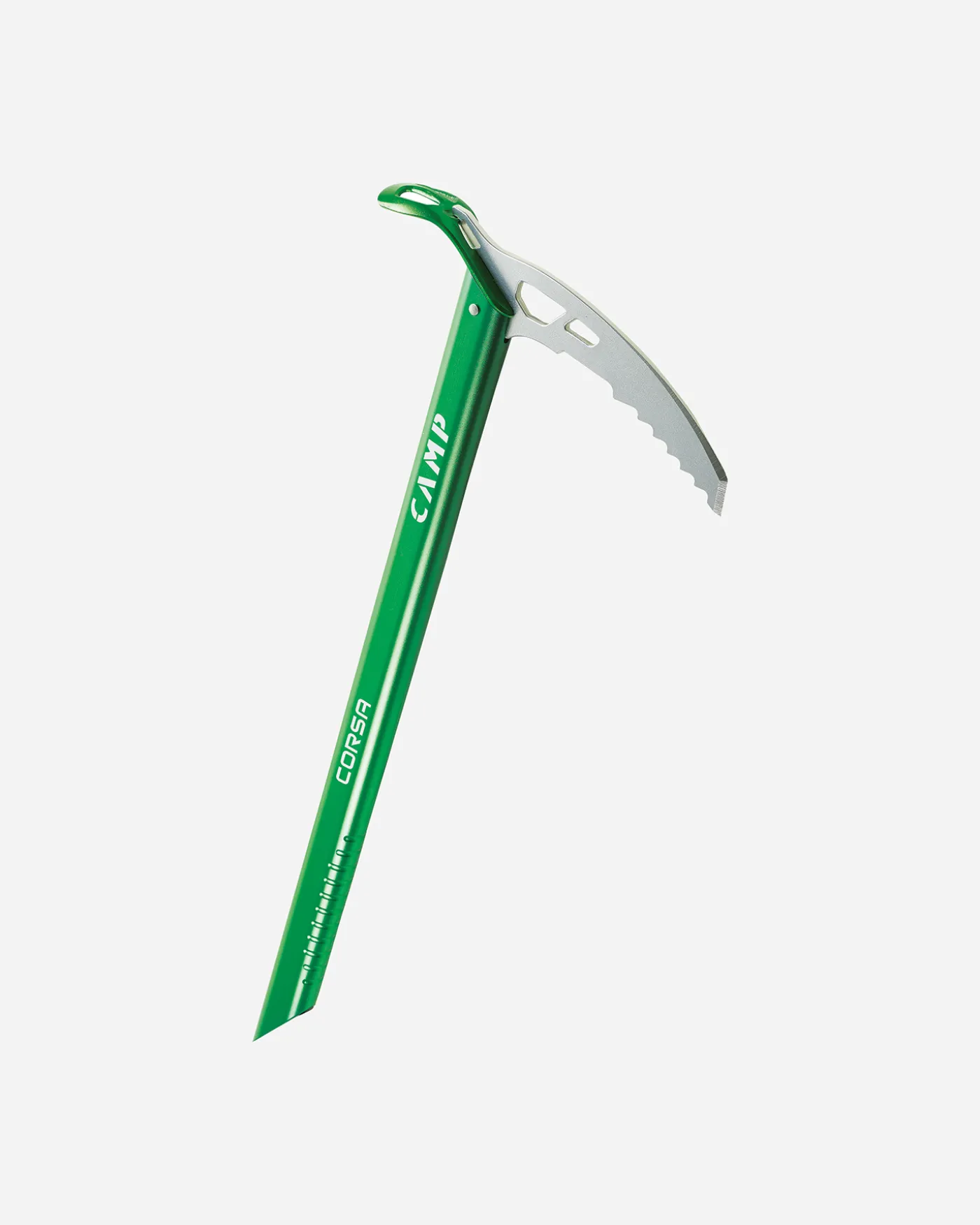 La piccozza Camp Corsa รจ superleggera, ideale per l’escursionismo su neve e ghiacciai e per lo scialpinismo. La costruzione in alluminio garantisce la leggerezza dell’attrezzo soddisfacendo i requisiti della norma EN 13089 Tipo 1. Uno speciale inserto in Nylon impedisce alla neve di penetrare ed accumularsi nella piccozza. Il grip ricavato nella parte inferiore del manico, assicura una buona presa. Lo slot nella parte posteriore della testa permette il fissaggio della Dragonne Corsa (disponibile separatamente). Non adatta per arrampicata su ghiacco verticale e terreni misti impegnativi.